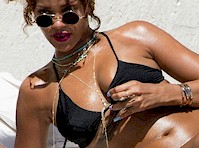 Great candids of Rihanna wearing a tiny black bikini and looking well oiled at the beach!
