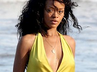 Here’s Rihanna wearing a yellow dress but no bra during a photo shoot in Barbados!