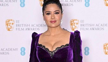 Salma Hayek showing plenty of cleavage in a purple dress while posing on the red carpet at the 2022 British Academy Film Awards in London!