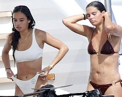 Candids of models Sara Sampaio and Kelsey Merritt looking amazing in bikinis while aboard a yacht in Corsica!