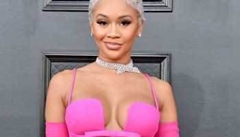 Saweetie showed plenty of cleavage in pink while attending the 64th Annual GRAMMY Awards in Las Vegas!