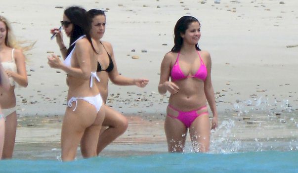 Looks like Selena Gomez put on a few pounds… but, she is still looking might nice in these bikini / swimsuit candids from a beach in Mexico!! Especially in that pink bikini! Love the slight underboob, and how her and her naughty friends are all frolicking at the beach like they are in one of my fantasies.