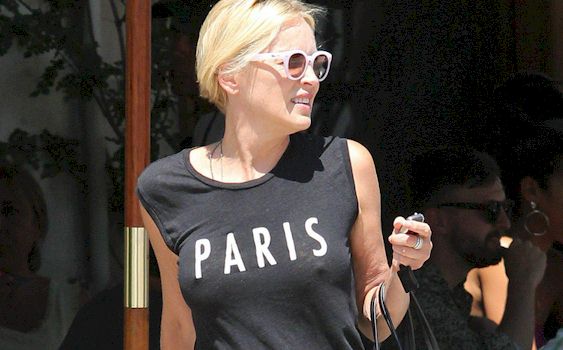 Sharon Stone was out and about in LA wearing a t-shirt which says PARIS on it. She wasn’t wearing a bra though which makes for these delicious pokies pics. I can never tell if she’s aging well or not?
