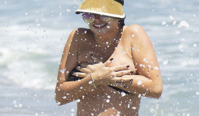 Here’s British reality star Stacey Giggs coming close to flashing a full tit, but getting away with an areola slip, while almost losing her bikini top in the surf at a beach in Marbella!