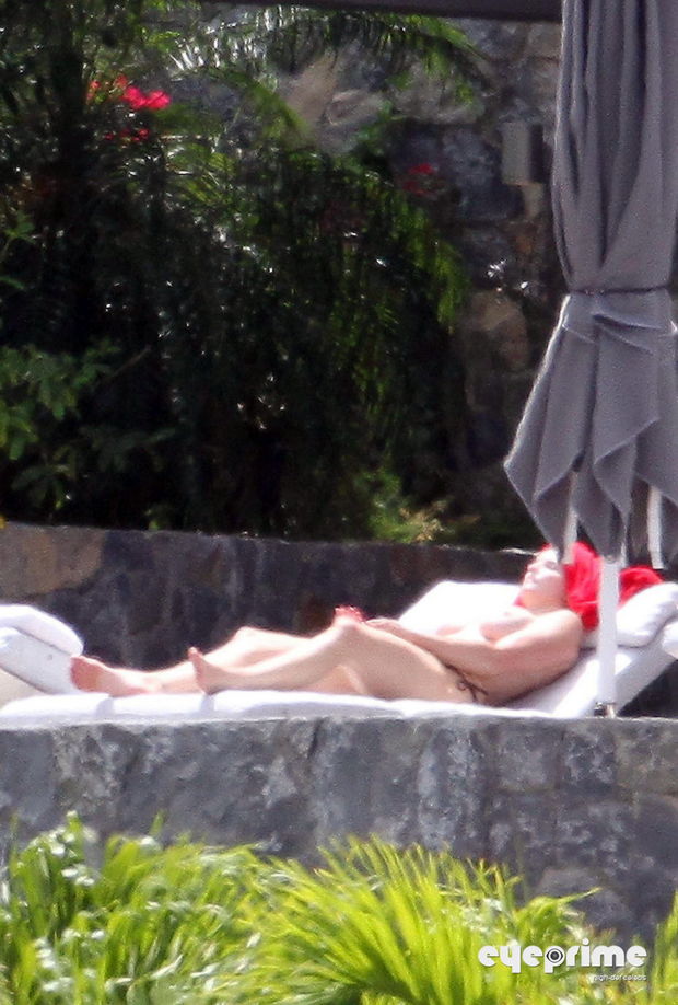 Candids of a topless Stephanie Seymour letting the sun shine on her big boobs at her home in St. Barts! Looking good!