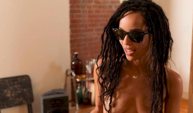 Kat Graham arriving to the Monot Womenswear fashion show during Paris Fashion Week in a low cut dress with plenty of cleavage and a hint of nipple on display! View the pictures