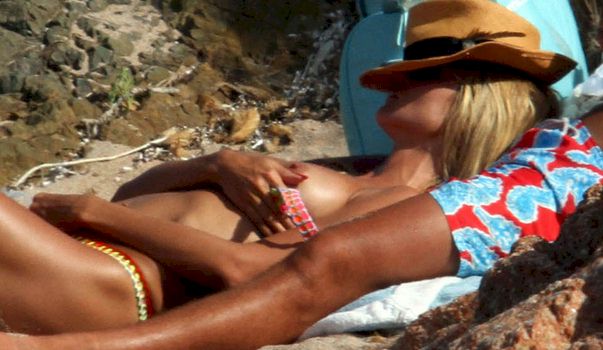 Bikini candids of Gisele Bundchen at a beach somewhere. Looking pretty good but also a little red.
