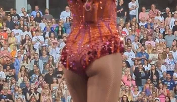 Sabrina Carpenter wearing pink shorts while spreading her legs suggestively during a recent performance!