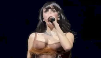 Noah Cyrus performs on stage at the 2025 Coachella Valley Festival in a sheer dress! We can see her nipples and white panties!