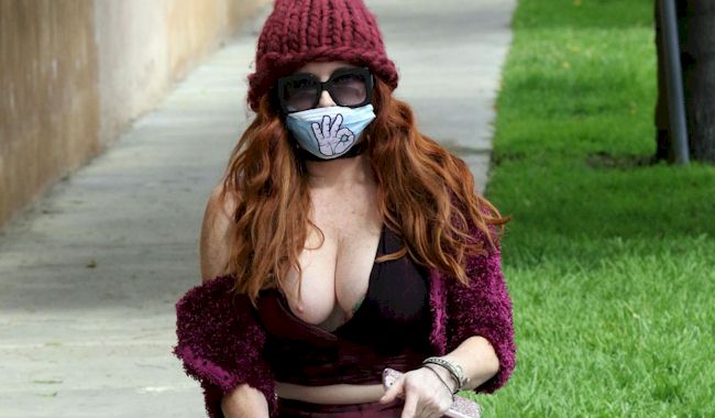 “Candids” of Phoebe Price showing a full tit while taking her dog for a walk in Los Angeles and also wearing a fashionable face mask. View the pictures