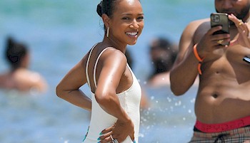 Amazing candids of Charlize Theron at the beach in Tuscany, Italy! Not only is she wearing a white swimsuit that becomes somewhat see through after a dip in the ocean but we also get a camel toe and more importantly – Charlize Theron was caught topless after her swim and showing butt crack as well! View the pictures