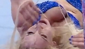 Torrie Wilson showing off her boobs by posing in a wet see through top in the shower!
