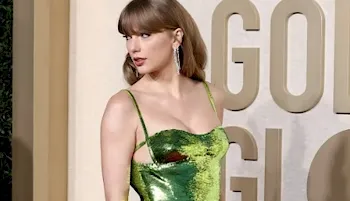 Taylor Swift showing cleavage in a shiny green dress as she attends the 81st Annual Golden Globe Awards!