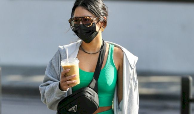 Candids of Vanessa Hudgens showing nipple pokies in a sports top while grabbing an iced coffee after a session at Dogpound Gym in West Hollywood!