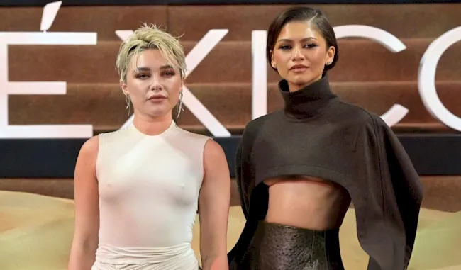 Florence Pugh showing great nipple pokies in a tight dress at the Dune: Part Two fan event in Mexico City! Bonus Zendaya underboob! View the pictures